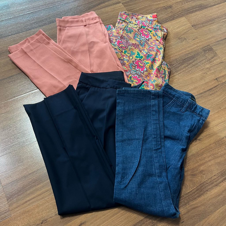 1.다홍 슬랙스(S) - 5000원 다홍색에 핑크 한 방울 섞은 오묘한 색감 슬랙스 봄에 입기 좋은 산뜻한 색상 사용감 약간 있음 허리 35 힙 47 총장 90 2.청 슬랙스(S) - 8000원 슬렉스인데 청이라 유니크 스판도 있어서 엄청 편하고 핏도 이쁨 허리 33 힙 42 총장 88 3.칼라거펠트 네이비 슬랙스(66) - 1만 한번입어 상태 좋고 원단 산뜻하고 편함 발목트임 약간 있어 활동성 좋고 디자인 깔끔 허리 38 힙 47 총장 92 4.오일릴리 플라워슬랙스(S) - 2만 유니크한 프린팅에 화려하지만 고급진 슬랙스 오일릴리 특유의 패턴 너무 이쁨 27~28추천 허리 38 힙 46 총장 96