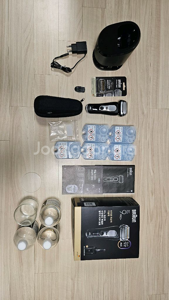 브라운 Series 9 PRO+ 울트라씬 9660cc 블랙 면도기 풀세트입니다. - 구성품: 면도기 본체, 세척&충전 스테이션, 충전기, 설명서, 케이스, 브러쉬 - 정품브라운세정액 5개 - 아이스버블 500ml 세척액 새것2개 등 (세척액 유통기한 2027년 9월 8일) -추가 면도날 5번정도 사용한 완전 거의 새제품입니다;; 사용하고 나서 바로 세척하고 말려서 보관해 상태 아주 좋습니다.