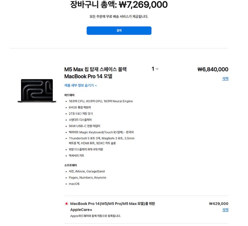 애플 맥북 프로 14 M5 Max 칩 스페이스 블랙 모델 미개봉입니다 3월11일 받은 애플정품입니다 애플케어 포함입니다 약 90만원 할인해드립니다 주요 스펙은 다음과 같습니다: - 2TB SSD 저장 장치 - 64GB 통합 메모리 - 18코어 CPU, 40코어 GPU, 16코어 Neural Engine - 96W USB-C 전원 어댑터 - 썬더볼트 4 포트 3개, MagSafe 3 포트, 3.5mm 헤드폰 잭, HDMI 포트, SDXC 카드 슬롯 - 외장 디스플레이 최대 4대 지원 MacBook Pro는 전문가를 위한 최고의 노트북으로, 강력한 성능과 놀라운 디스플레이를 제공합니다