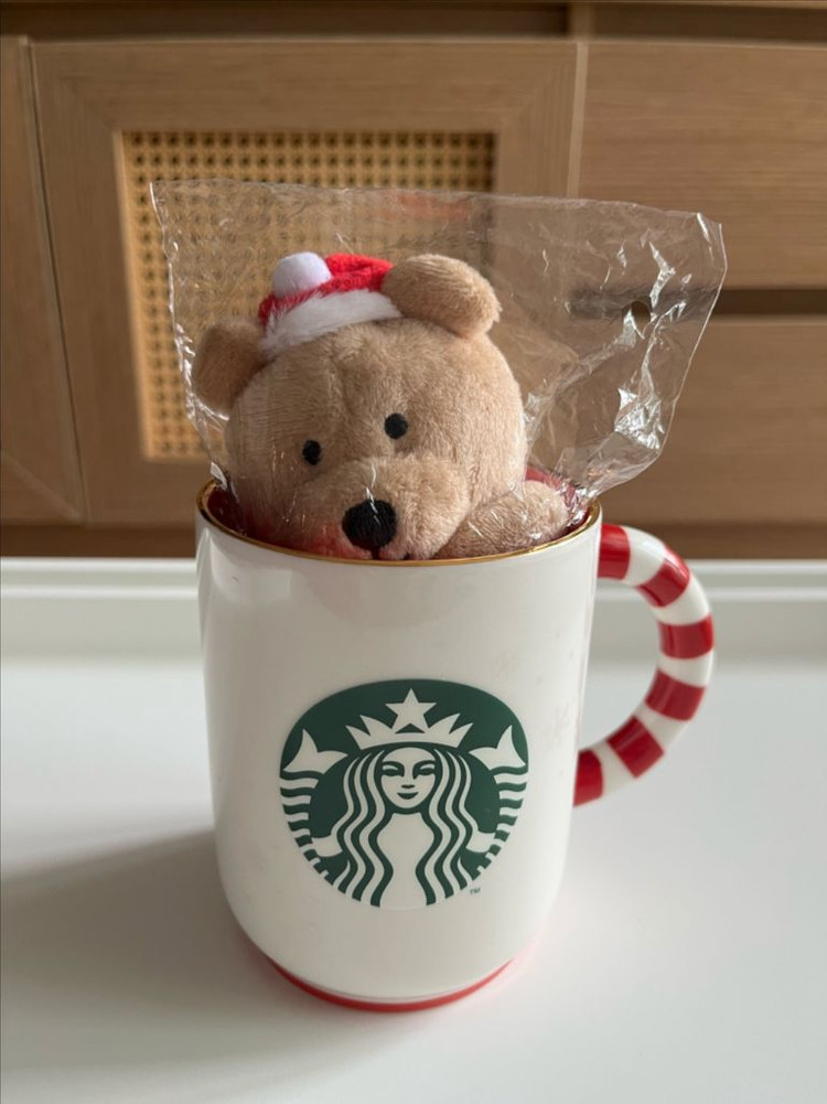 스타벅스 크리스마스 캔디케인 머그와 곰인형 세트입니다 새 제품인데 상자가 어딨는지 안보여요ㅠ 장식장에 보관만해뒀어요