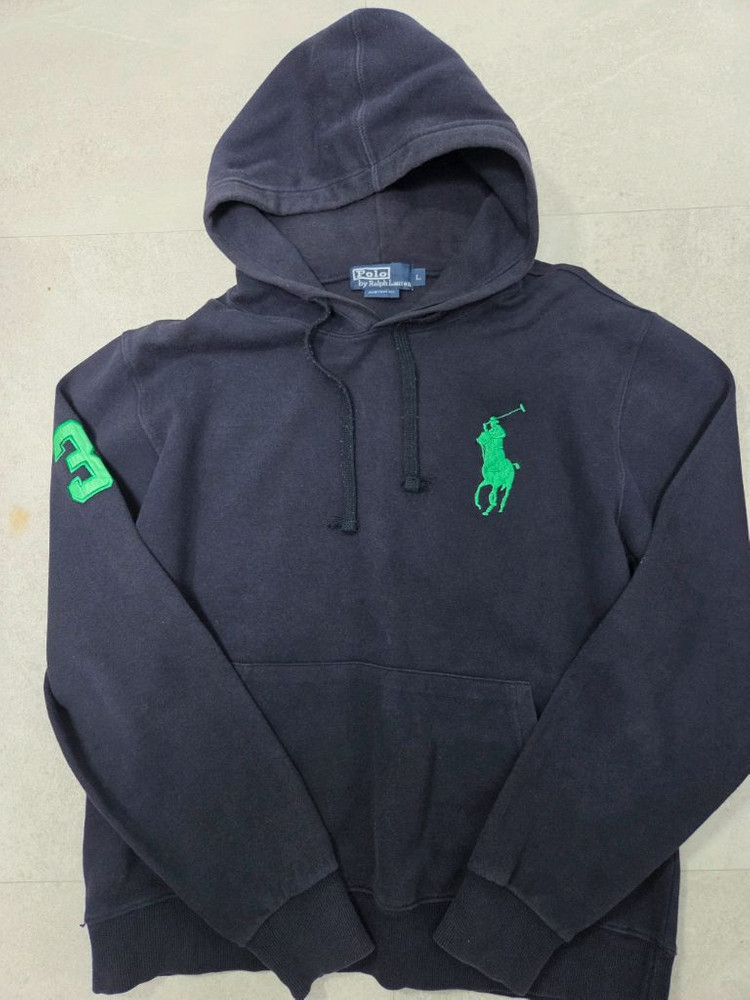 폴로의 상징인 빅포니 자수가 돋보이는 후드티입니다. 흔한 화이트 자수가 아닌, 유니크한 그린 컬러 자수와 소매의 '3' 패치 조합이 정말 고급스럽고 예뻐요. 핏: 커스텀 핏 (Custom Fit)으로 부해 보이지 않고 깔끔하게 떨어지는 실루엣입니다. 상태: 사진 보시다시피 전체적으로 깨끗하며, 시보리 짱짱합니다. 자연스러운 사용감 외에는 큰 오염이나 하자 없습니다. 사이즈: 표기 L (평소 100~105 입으시는 분들께 추천드려요) 어깨 51 가슴 54 총장 64 특징: 네이비와 그린 조합이라 청바지, 면바지 어디에나 코디하기 편합니다. 지금 시즌에 단품으로 입기 딱 좋아요!