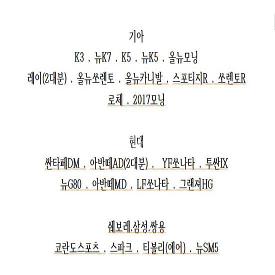 개인정보(거래정보)를 주고받는 행위는 사기에 노출될 수 있으므로 즉시 중고나라로 신고해 주세요기아 K3 . 뉴K7 . K5 . 뉴K5 . 올뉴모닝 . 레이 올뉴쏘렌토 . 올뉴카니발 . 스포티지R . 쏘렌토R . 로체 . 2017모닝 현대 싼타페DM . 아반떼AD . YF쏘나타 . 투싼IX . 뉴G80 아반떼MD . LF쏘나타 . 그랜져HG 쉐보레.삼성.쌍용 코란도스포츠 . 스파크 . 티볼리(에어) . 뉴SM5 지역은 충북 청주이며 현대 판매하고 있는 가다는 위에 상세히 적어두었습니다. 개당 15,000원에 판매 하고 있습니다~
