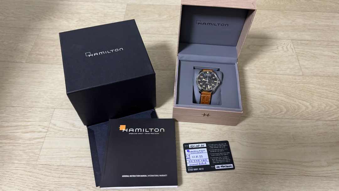 해밀턴 카키 파일럿 데이데이트 가죽 시계판매합니다 2020년 1월 신라면세점에서 구매했습니다 - 구성품은 사진에 보이는 박스, 보증서, 설명서 모두 포함입니다 깨끗합니다 다만 가죽은 세월과 사용감이 꽤 됩니다 아껴서 잘 착용 하던거예요 제품 하자는 전혀 없습니다 반품 환불은 불가