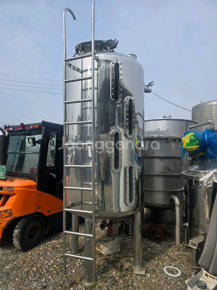 스테인리스 재질의 산업용 탱크입니다. 사다리가 설치되어 있어 접근성이 용이합니다. 외관 상태는 사진에서 보시는 바와 같습니다. 안쪽 에어를 불어서 각종씨앗 세척용도로 사용하던 제품입니다. 지름 1.2m 높이 2m 전체높이 3.3m 용량 2200리터 경기도 양주시 상차도 배송비 별도 010. 5230. 7772.