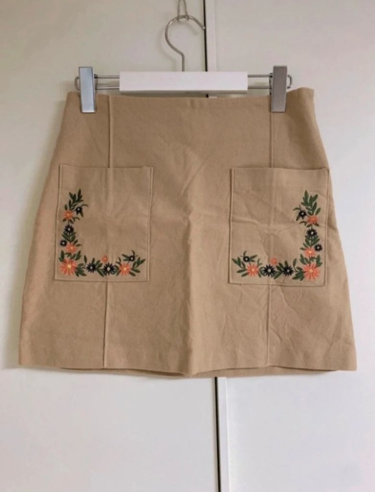 플라워 자수 미니 스커트 M 사이즈예요 귀여운 플라워 자수가 포인트랍니다! - 사이즈: M - 색상: 베이지 편하게 입기 좋은 스커트예요~