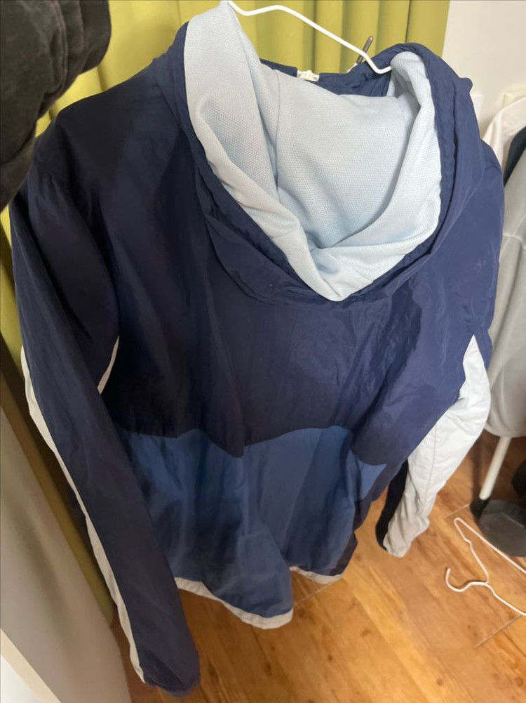 정품 후드 집업이에요. 네이비와 라이트블루 컬러 조합이 깔끔하고 상태도 양호합니다. 가볍고 활동하기 편한 디자인으로 데일리 착용하기 좋아요.