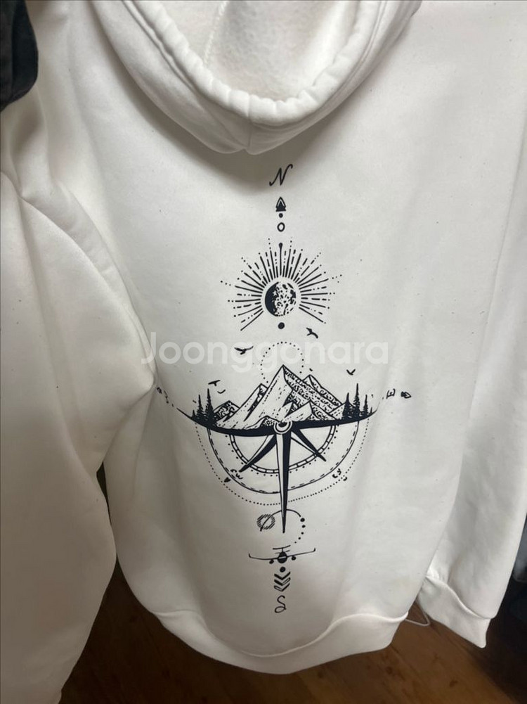 화이트 컬러 후드티예요. 뒷면에 독특한 로고 디자인이 프린트되어 있고, 전체적으로 깔끔한 상태입니다. L사이즈로 착용감 좋아요!