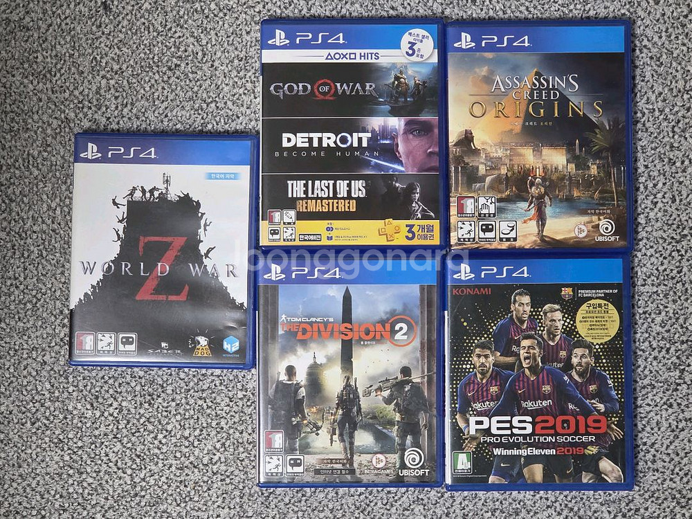 개인정보(거래정보)를 주고받는 행위는 사기에 노출될 수 있으므로 즉시 중고나라로 신고해 주세요PS4 게임 타이틀 6개 일괄 판매합니다 - 갓오워, 디트로이트비컴휴먼합본(라스트오어스는 디스크 분실) - 어쌔신크리드 오리지널 - 톰클랜시 디비전2 - PES 2019 - 월드워Z 전체적으로 상태는 양호하며 정상작동 확인했습니다.
