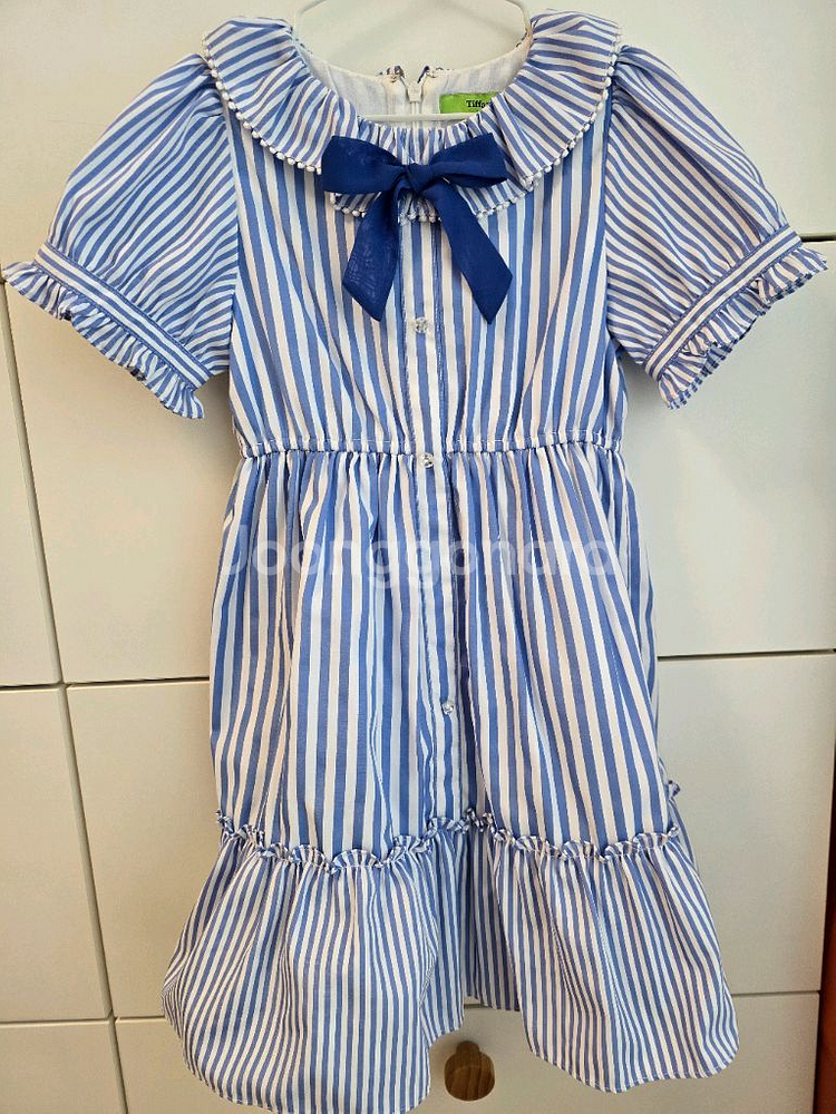 티파니키즈 블루 스트라이프 원피스예요. 120 사이즈로 얼룩이나 뜯김 하나도 없이 깔끔한 상태이고 여름에 입기 좋은 디자인이에요. 리본 포인트가 예쁘고 리본은 탈부착 가능합니다 택포 3만원