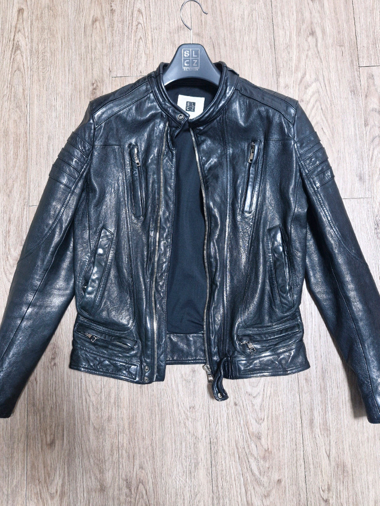 슬림 라지 입니다 실측 꼭 확인하세요 가죽과 부자재 좋은 것을 쓰기로 유명한 국내 생산 브랜드입니다. 딱 보시면 무게감 있는 두툼한 좋은 가죽 재킷이라고 생각하실 거예요. 디자인이 굉장히 좋습니다. 어깨 45 가슴 48 팔 63 총장 66 참고 사진 178/68