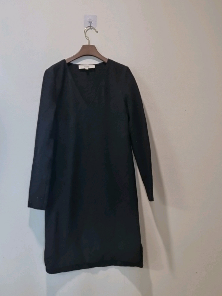 바네사브루노 athé 블랙 니트 원피스입니다. 심플한 V넥 디자인으로 단정하면서도 고급스러운 분위기라 단독으로 입어도 예쁘고 코트 안 이너로도 활용 좋아요. 울 혼방 니트라 따뜻하고 착용 시 핏이 깔끔합니다. 유행 크게 타지 않는 기본 디자인이라 오래 입기 좋아요. • 사이즈 : 36 (국내 55 추천) • 가슴단면 : 45cm • 총장 : 91~92cm • 소재 : 울 65 / 나일론 35 • 색상 : 블랙 • 상태 : 전체적으로 상태 좋은 편 예민하신 분은 패스 부탁드립니다.