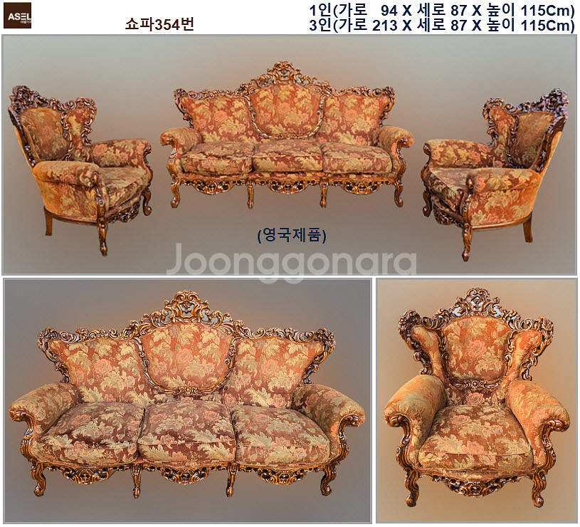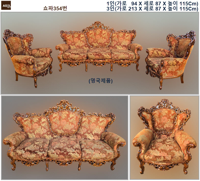 고급스러운 엔틱 스타일의 소파세트예요. 골드 장식과 우아한 패턴이 돋보이는 클래식한 디자인으로 거실을 한층 고급스럽게 만들어줄 수 있어요. 상태 양호하고 실용적인 사이즈로 다양한 공간에 잘 어울려요.경기도 하남시 상일IC 근처에 있는 대형 창고형 매장입니다 호텔중고가구를 전문 판매하고 있으며 전국 착불배송 판매하고 있습니다. 엔틱가구, 빈티지가구, 콘솔, 쇼파, 테이블, 웨곤, 원탁, 러브테이블, 책상, 화장대, 베드벤치, 의자, 식탁, TV장, 수납장, 장식장, 스텐드, 거울, 조명, 분수, 옷걸이, 고가구, 장식대, 파티션, 커튼,액자, 소품, 사무용가구, 카페가구, 식당의자 등을 판매합니다. 업체명 : 아셀가구 ( http://asel.o-r.kr ) 거래방식 : 직거래, 온라인 용달착불 매장주소 : 하남시 풍초로 (방문시 예약필수) 가격은 하단에 있습니다 문의 02-488-1008, 010-3113-5035