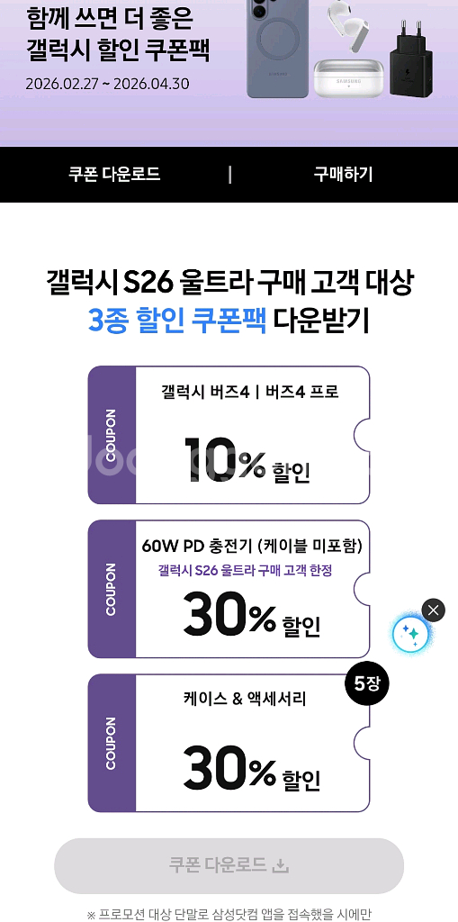 S26 할인쿠폰 갤럭시 버즈4 버즈4프로 10%