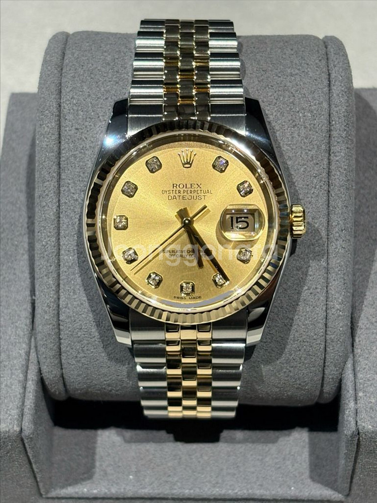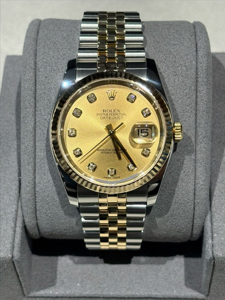 중고 롤렉스 데이트저스트 36 옐로골드 콤비 샴페인 다이아몬드 116233 (G) 36 mm 옐로골드 콤비(쥬빌리), 샴페인 다이얼, 다이아몬드 인덱스 브랜드 보증서 있고 정품 박스는 없습니다. 스탬핑 일자는 2015년 국내 입니다. 폴리싱 했고 마디 갯수 다 있습니다. 2025년 12월 오버홀 했습니다. 서울, 부산 직거래 하고 외 지역도 가능합니다.