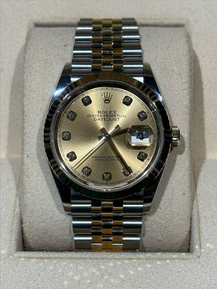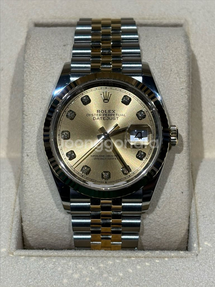 중고 롤렉스 데이트저스트 36 옐로골드 콤비 샴페인 다이아몬드 126233 (G) 36 mm 옐로골드 콤비(쥬빌리), 샴페인 다이얼, 다이아몬드 인덱스 브랜드 보증서, 정품 박스 다 있습니다. 폴리싱 했고 마디 갯수 다 있습니다. 전반적으로 시계 상태 깔끔합니다. 서울, 부산 직거래 하고 외 지역도 가능합니다.