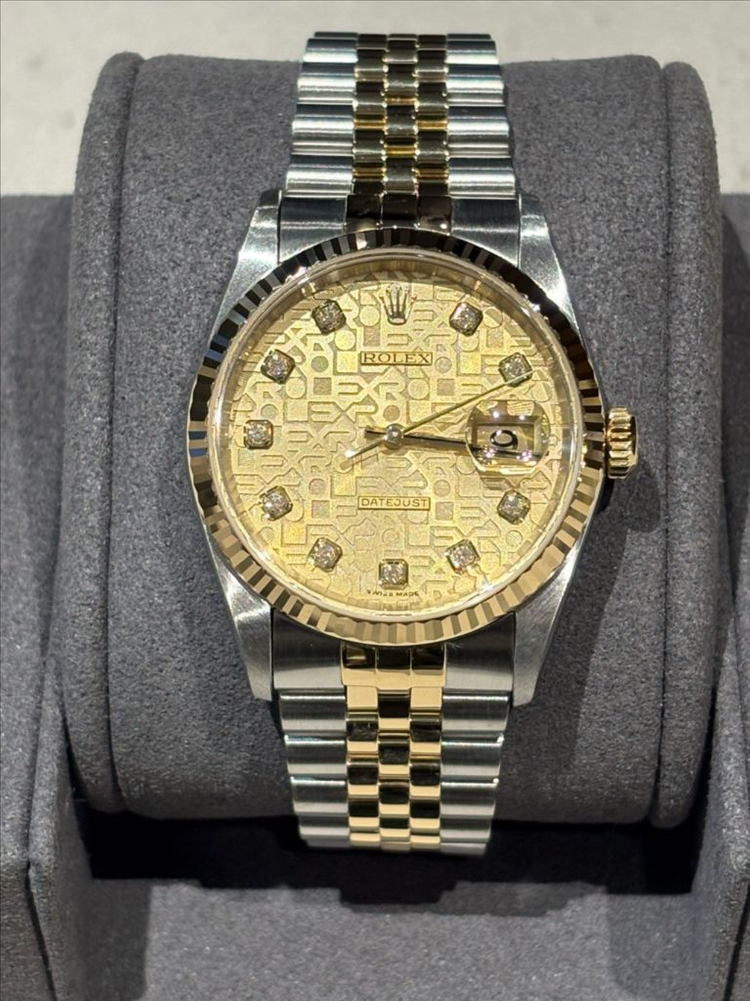 중고 롤렉스 데이트저스트 36 샴페인 쥬빌리 다이아몬드 16233 (G) - Y 단위 * Y 단위 : 2002년 ~ 2003년 생산된 모델입니다. 36 mm 옐로골드 콤비(쥬빌리), 샴페인 쥬빌리 다이얼, 다이아몬드 인덱스 브랜드 보증서, 정품 박스 다 없습니다. 폴리싱 했고 마디 갯수 다 있습니다. 전반적으로 시계 상태 깔끔합니다. 12시 방향 브레이슬릿 금장식 제작 되었습니다. 서울, 부산 직거래 하고 외 지역도 가능합니다.