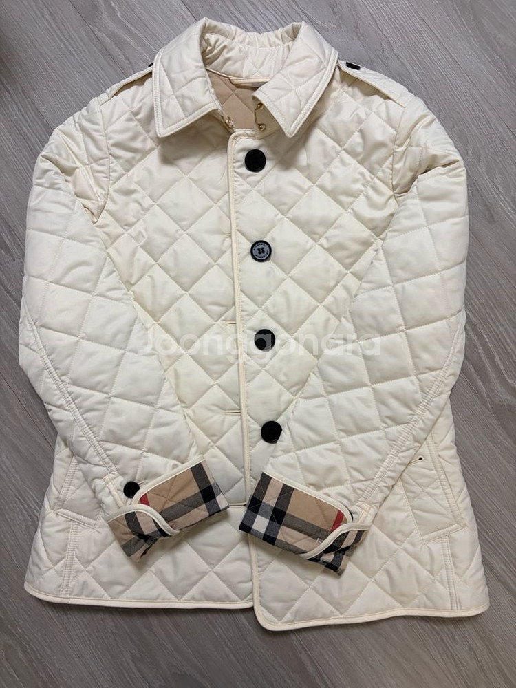 버버리 퀼팅 자켓입니다. 작년에 구대로 구매했어요. 화이트 색상이고 퀼팅 패턴이 특징입니다. 신형이라 소매 안쪽에 버버리 특유의 체크 패턴이 있습니다. 사이즈 미스라 택 제거 해놓고 제대로 입지를 못해서요. 상태는 사진과 같이 이염이나 찢김 없이 최상입니다만 예민하신 분은 피해주세요. 중고거래니 환불 불가입니다. 사이즈 조언은 어렵지만 S사이즈라 ~55이신분이 잘 맞을 것 같아요. 택포 가격이요