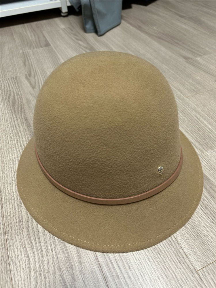 헬렌카민스키 모자 L 사이즈입니다 100% 양모 재질로 되어있고, 베이지색상에 가죽 장식띠가 둘러져 있습니다 실착2회로 상태 매우좋습니다