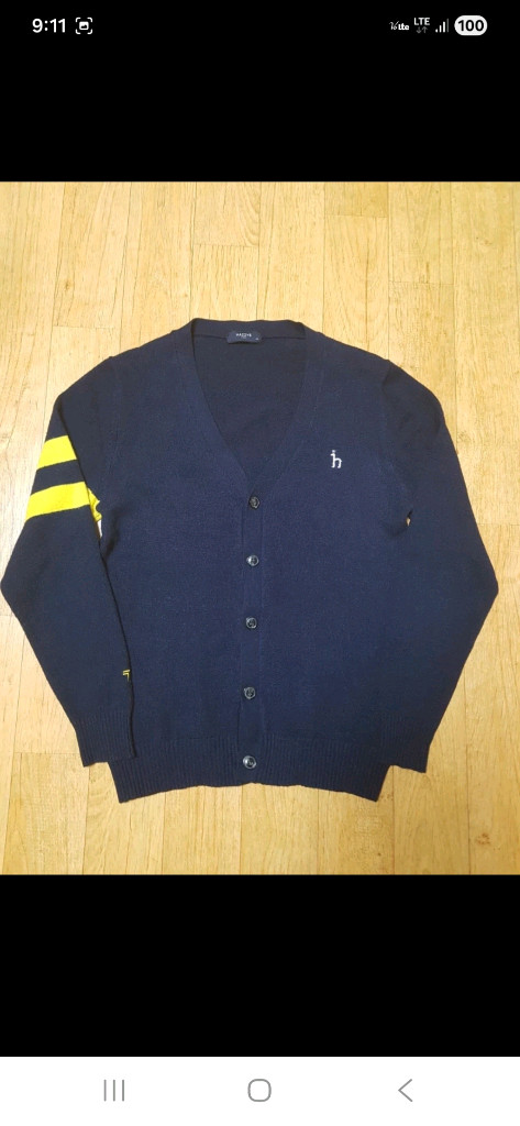 진한 네이비 색상에 팔 부분 노란색이 포인트입니다 사이즈는 95입니다 가슴단면은 48cm, 총길이는 65cm 입니다 봄, 가을, 겨울 다 입을 수 있는 얇은 가디건 입니다 흡습성이 좋은 레이온 혼방 소재로 쾌적하게 착용 가능합니다 부드러운 터치감과 편안한 착용감을 제공합니다 신축성도 엄청 좋습니다 이염, 색바램, 미세구멍, 등 하자 하나도 없고 전체적으로 새옷처럼 양호하고 깨끗합니다 연락주세요