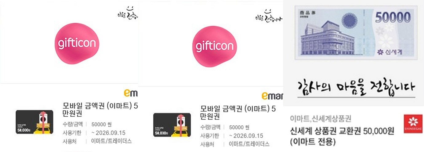 이마트 모바일 금액권(10만) + 신세계 상품권 교환권(이마트 전용 5만원) 2026년 9월 중순까지 144,000원 / 입금 확인되면, 바코드 드립니다. 바코드 발송 후 취소 불가.