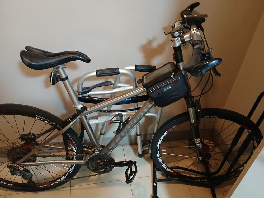 산악자전거 판매합니다. 실버 프레임에 블랙 포인트로 깔끔한 디자인이에요. 사용감은 있지만 기능상 문제없이 잘 작동합니다.