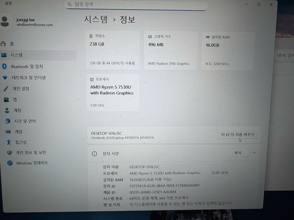 고성능 게이밍 노트북으로 AMD 라이젠 7530U 프로세서와 16GB 메모리가 탑재되어 있어요. 깔끔한 상태로 잘 관리된 제품입니다.