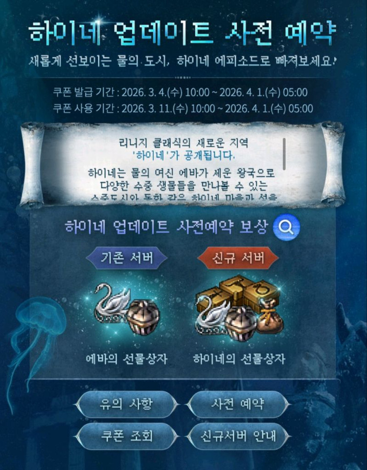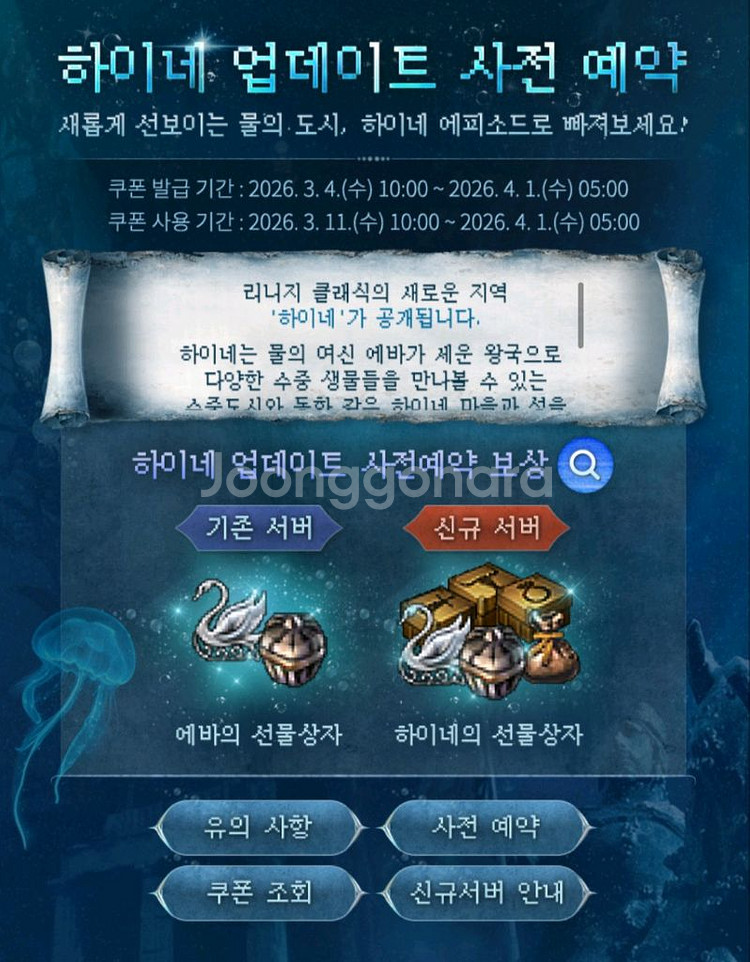 개인정보(거래정보)를 주고받는 행위는 사기에 노출될 수 있으므로 즉시 중고나라로 신고해 주세요리니지클래식 하이네,로엔 신서버쿠폰 통판매합니다 200장 50장 100장도 짤라서 판매합니다