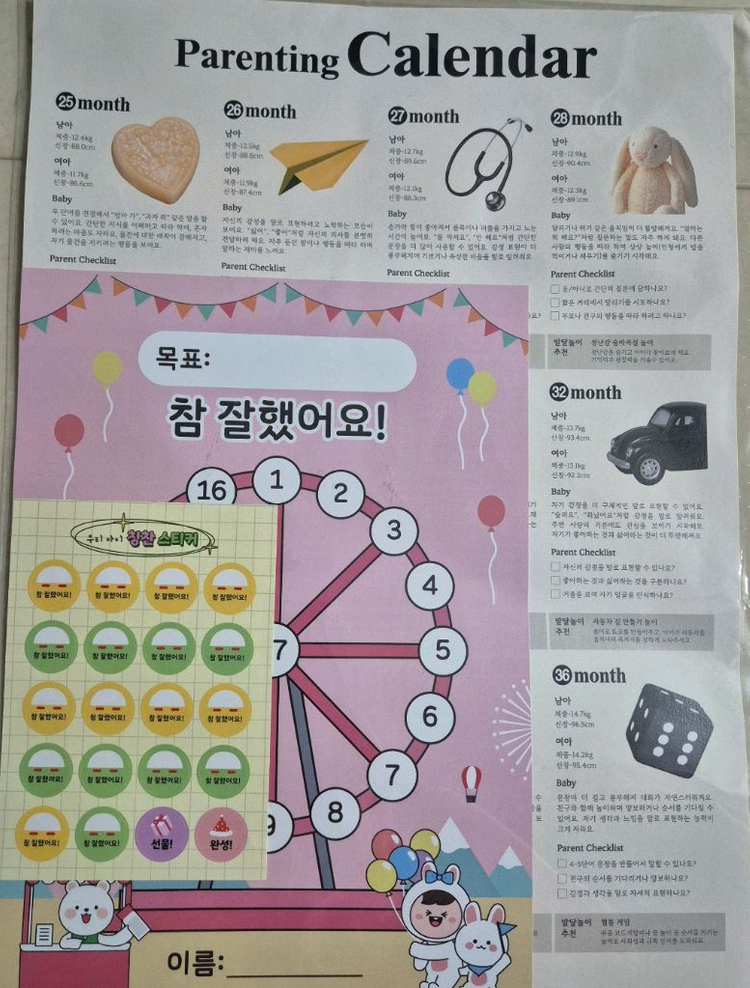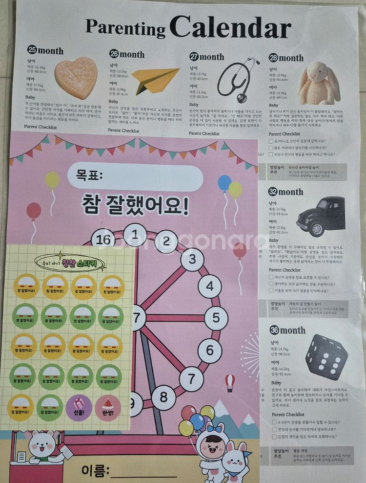 육아달력입니다. 25개월 ~ 36개월까지의 평균 키 몸무게와 해당 개월수 발달 내용이 기재되어있어요. 추가로 칭찬 스티커판도 같이 드립니다. 아이가 목표를 달성할 때마다 칭찬 스티커를 붙여주며 동기 부여를 해줄 수 있습니다. 직거래는 부천 고강초등학교 앞이나 여의도 63빌딩 하나은행 앞에서 원해요. 택배거래도 가능하고 편의점 반값택배도 가능합니다 😊 (GS25 : 당일 발송 / CU, 세븐일레븐 : 익일 아침에 발송드려요)