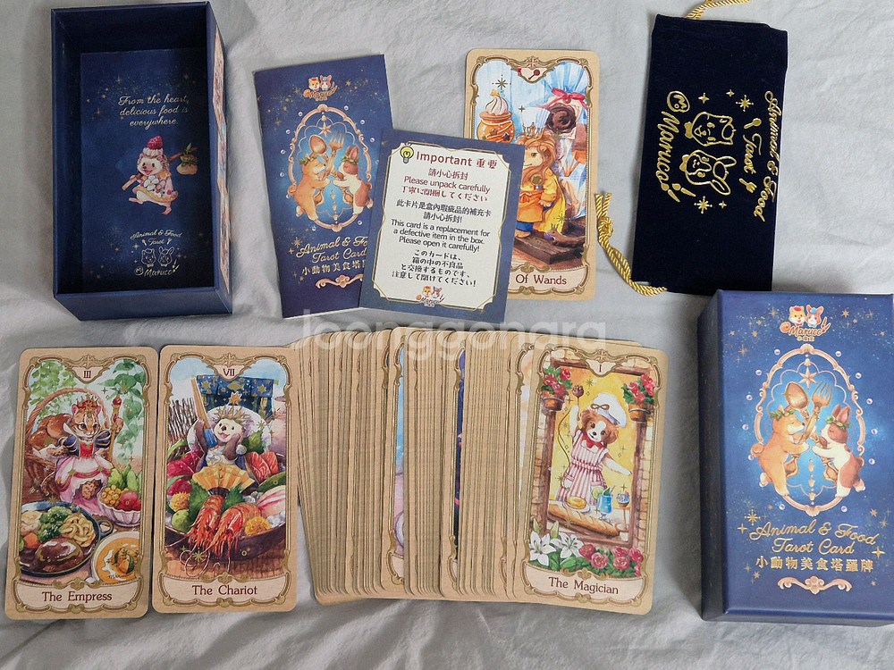마루코 애니멀 앤 푸드 타로카드 7.5 삼라만상 타로 4.7 마루코 애니멀 앤 푸드 미사용 동봉 물품 전부 있음 전용 덱 주머니, 오류 수정 카드, 보너스 카드 2장 삼라만상 미사용 보관용으로 보호비닐 착용 박스에 달린 끈이 떨어짐. 끈은 있어서 접착제나 테이프로 붙여서 사용하시면 될 것 같습니다.