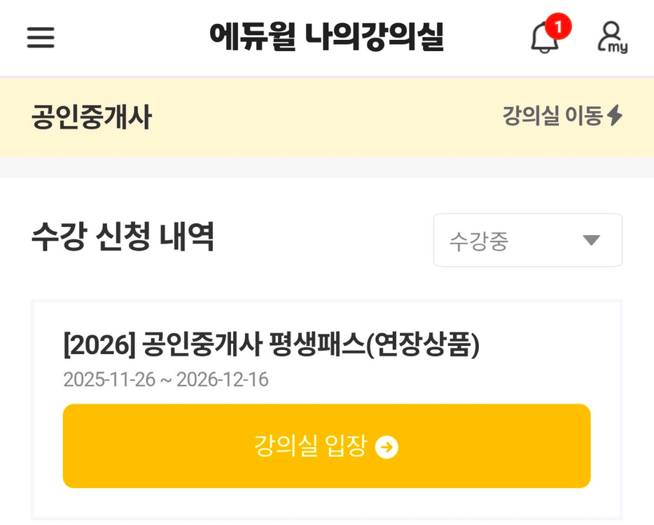 개인정보(거래정보)를 주고받는 행위는 사기에 노출될 수 있으므로 즉시 중고나라로 신고해 주세요2026년 공인중개사 1년 수강권이에요. 수강 신청 내역에서 확인 가능하며, 온라인 강의 수강할 수 있는 패스입니다. 교재X