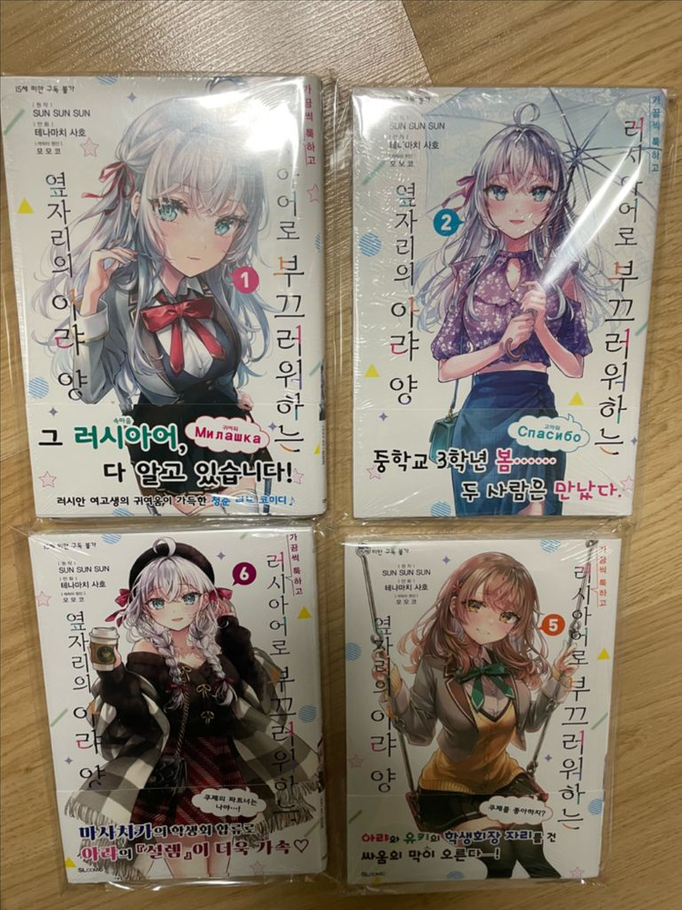 가끔씩 툭하고 러시아어로 부끄러워하는 옆자리의 아랴양 만화책 낱권 1,2,5,6초판 미개봉 팜 이중으로 opp봉투 포장 -서비스 카드 한장 드림(마지막사진 참고) -문의 없으시면 바로 결제하세요 -택배비 별도, 일반택배&씨유반값 택배 선택 -제주도는 일반 택배비에 3천원 추가 있습니다