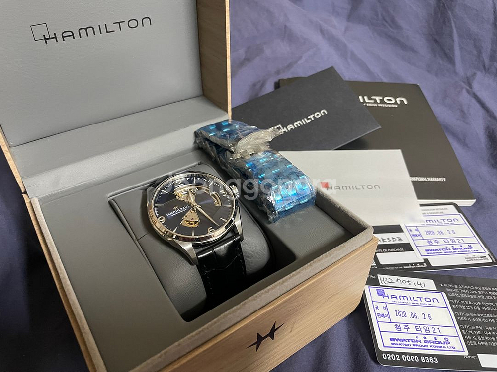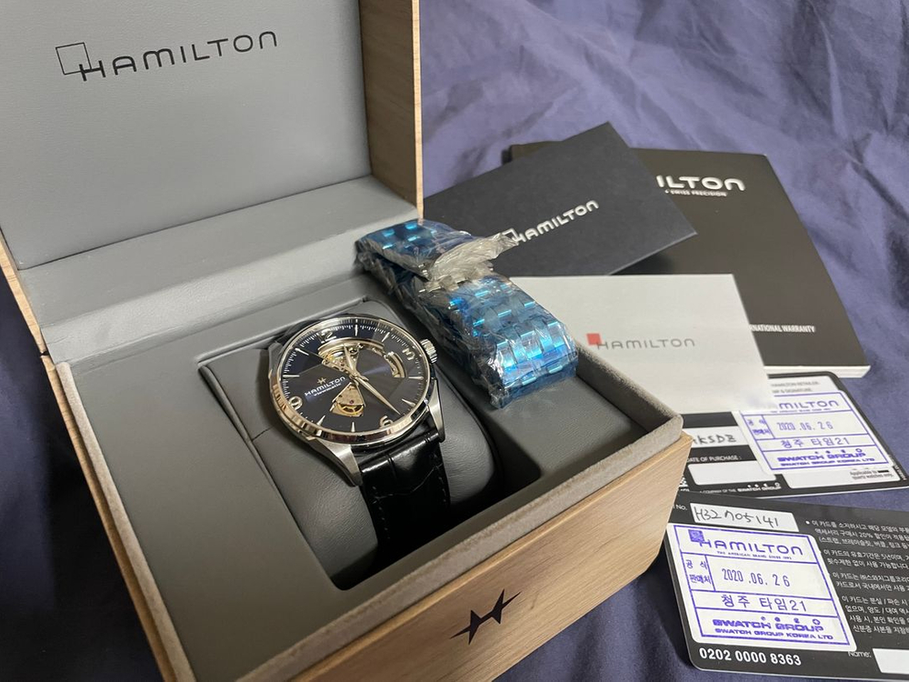 해밀턴 재즈마스터 오픈하트 2세대 42mm 20년 6월 구매 풀박스상태이며 실착용 횟수 10회 미만 , 최근 80시간 리저브 확인했고 이상무 케이스 앞뒤로 구매와 동시에 필름 착용중이며 기존 메탈 브레이슬릿 제품을 구매했고 해밀턴 정품 가죽줄을 같이 구매하여 상품 구매와 동시에 구매처에 교체요구하여 메탈은 새상품. 그 이후 줄질 한적없음 실생활 기스정도는 있으며 직거래는 창원입니다.