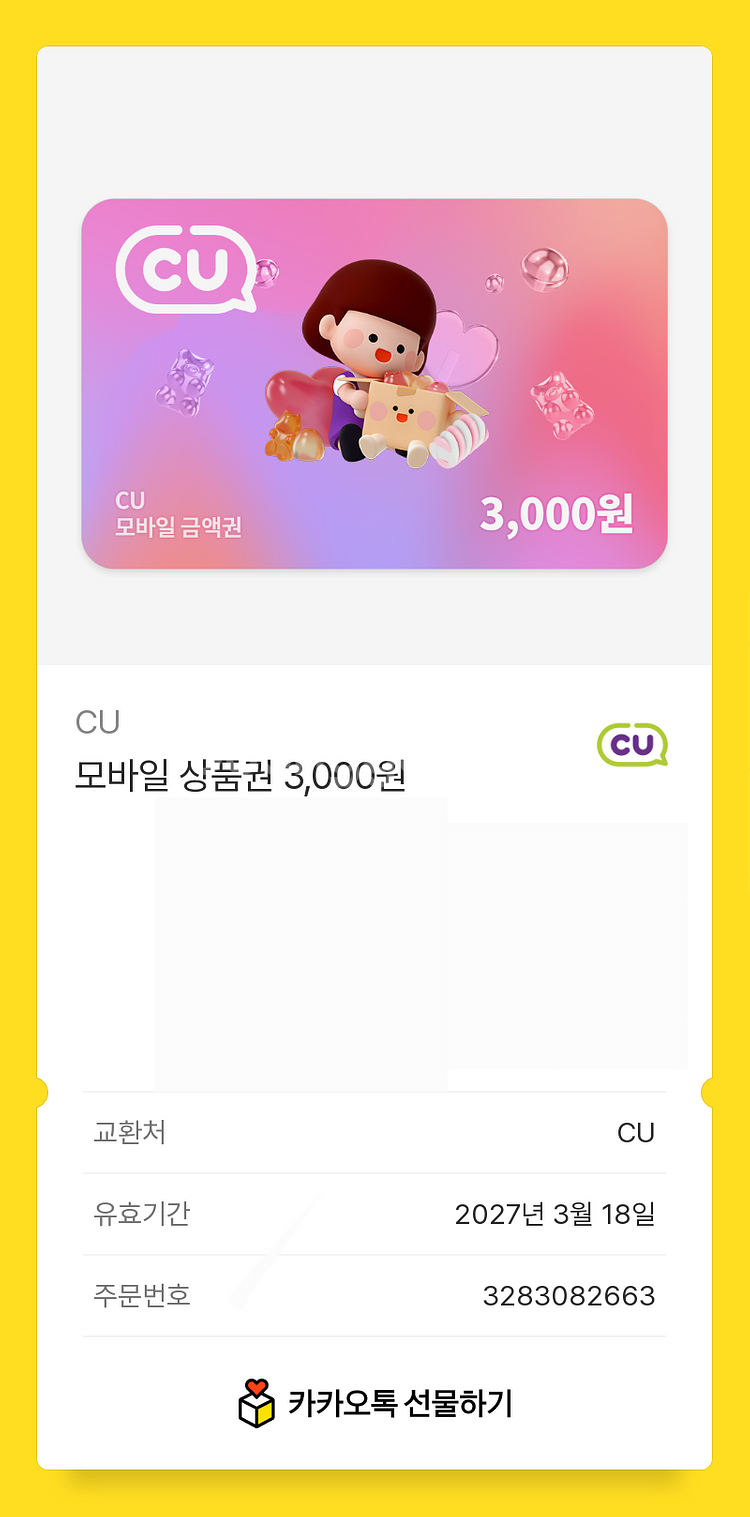 개인정보(거래정보)를 주고받는 행위는 사기에 노출될 수 있으므로 즉시 중고나라로 신고해 주세요편의점에서 사용 가능한 3,000원 모바일 상품권이에요. 유효기간은 2027년 3월 18일까지라서 충분히 사용하실 수 있어요!