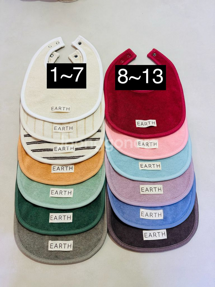 ⭐️새제품⭐️ 얼쓰빕(earth bib)13color 팝니다. 상품 문의 주실땐 번호로 얘기해주세요. ❌표시가 있는건 품절입니다. 몇몇컬러는 수량 넉넉히 있으니 편하게 문의주세요. 출산선물이나 외출용 턱받이로 좋아요🤍 1번 에크루크림 2번 베이지스트립(세로) 3번 브라운스트립(가로) 4번 오렌지❌ 5번 세이지그린 6번 글래스그린 7번 카키 8번 빈티지레드 9번 핑크 10번 라이트블루❌ 11번 코튼라벤더❌ 12번 퍼플 13번 브라운 거래는 둔촌동에서 문고리거래 하고 있고 GS반택이나 택배는 요금 추가시 발송 가능합니다. 입금시, 상세주소 전달 예정이며 네고문의는 받고 있지 않으니 구매에 참고 부탁드립니다.🙏🏻