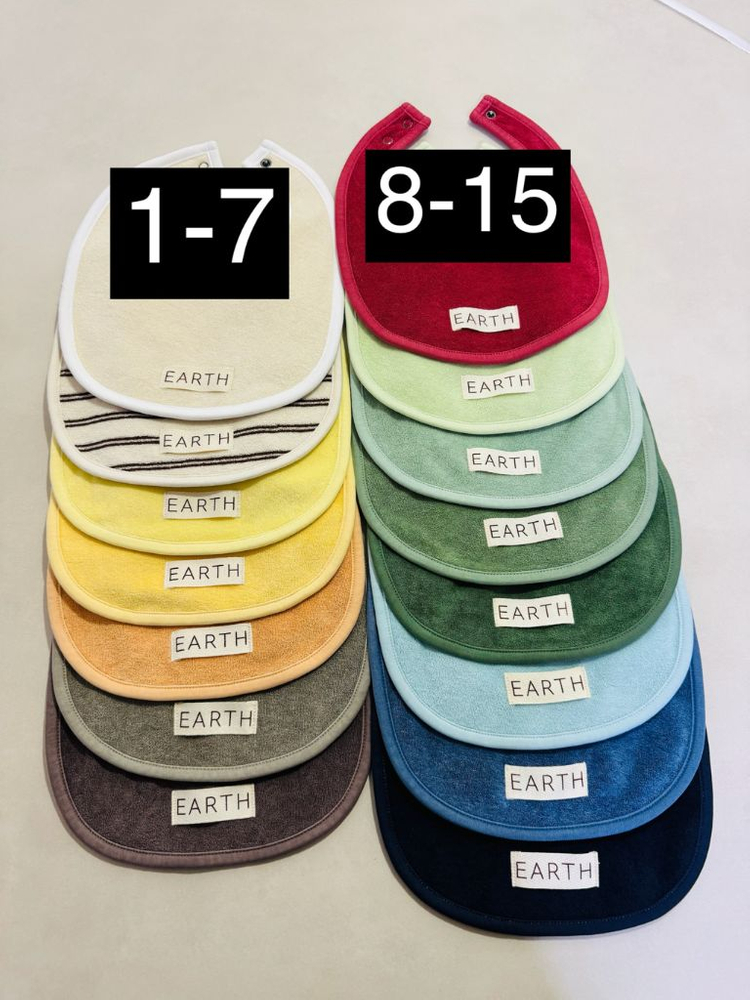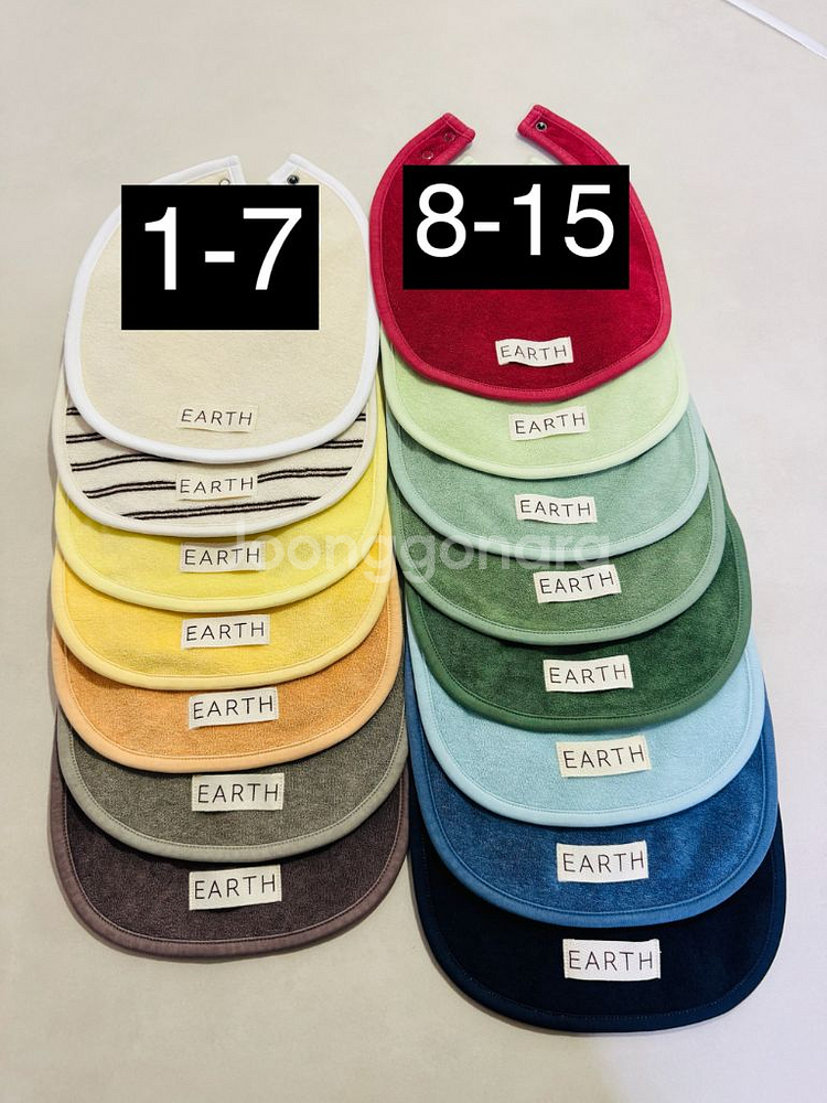⭐️새제품⭐️ 얼쓰빕(earth bib)15컬러 팝니다. 상품 문의 주실땐 번호로 얘기해주세요. ❌표시가 있는건 품절입니다. 몇몇컬러는 수량 넉넉히 있으니 편하게 문의주세요. 출산선물이나 외출용 턱받이로 좋아요🤍 1번 에크루크림 2번 브라운스트립(가로) 3번 크림옐로우 4번 옐로우 5번 오렌지 6번 카키 7번 브라운❌ 8번 빈티지레드 9번 멜론 10번 세이지그린❌ 11번 그린 12번 글래스그린 13번 라이트블루❌ 14번 블루❌ 15번 딥네이비❌ 반택/ 택배거래만 하고 있어, 참고 부탁드립니다. [추가요금] GS반택- 2,000원 일반택배- 3,500원