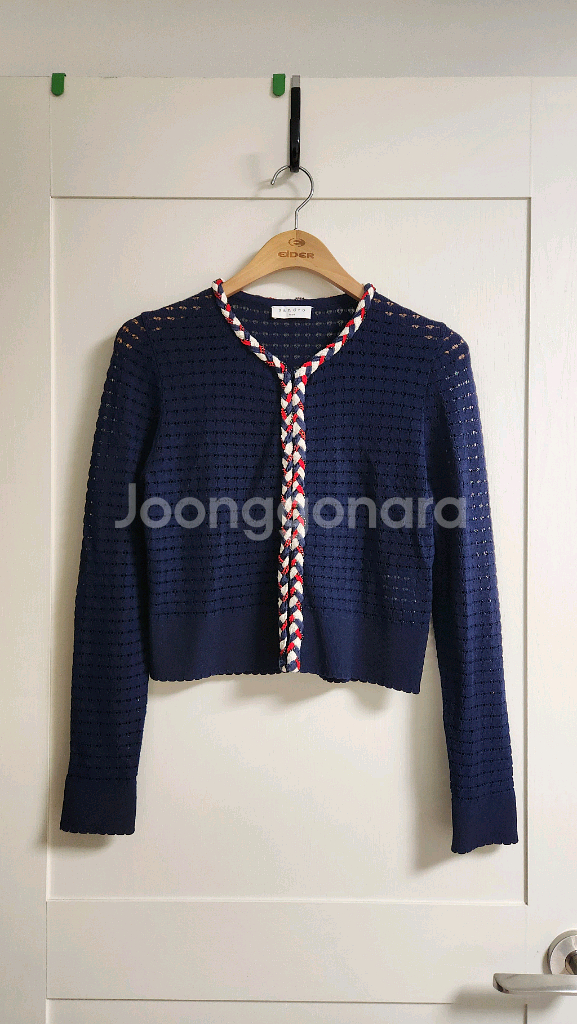 네이비 니트 가디건이에요. 목 부분과 앞면에 레드&화이트 체인 디테일이 포인트로 들어가 있어서 세련된 느낌이 나요. 상태 양호하고 깔끔하게 관리된 제품입니다. 산드로 네이비 가디건입니다 - 모델 번호는 SDM4910입니다 - 사이즈는 39로 55사이즈 추천합니다 상태 매우 좋아요 택배가능 추가4000원