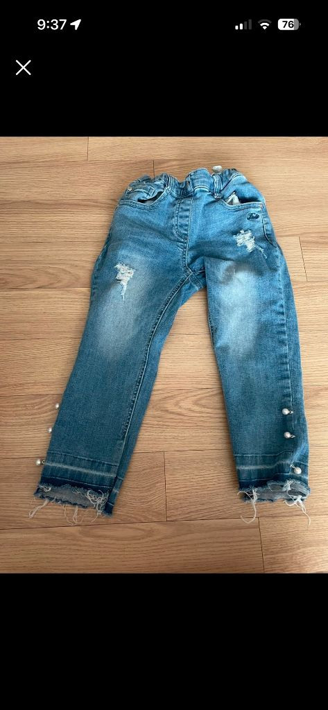 7T 닥스키즈 여아 청바지입니다. 무릎 쪽에 데미지 있고 밑단에 진주 디테일이 귀여워요. 허리도 고무줄이라 편하게 입을 수 있어요. 7사이즈에요 저희딸은 8세까지 입었구요 세네번정도 입은듯해요