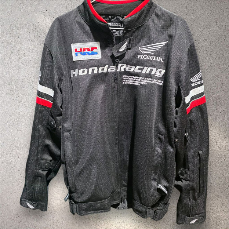 오토바이 라이딩용 메쉬 자켓이에요. 그레이 컬러에 레드 포인트가 들어가 있고, 등뒤로 로고가 새겨져 있어요. 통풍이 잘되는 메쉬 소재로 라이딩할 때 착용하기 좋습니다.