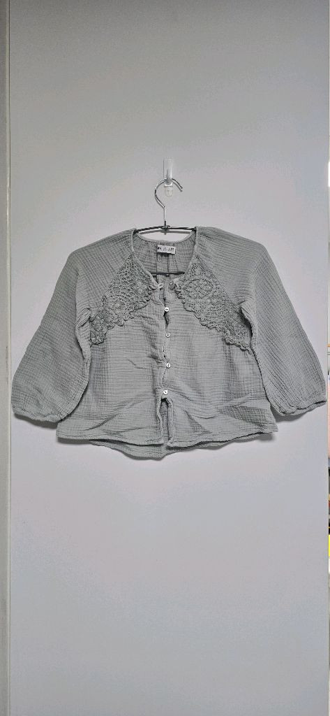 개인정보(거래정보)를 주고받는 행위는 사기에 노출될 수 있으므로 즉시 중고나라로 신고해 주세요예쁜 레이스 자수가 포인트인 그레이 컬러 블라우스예요. 앞면에 꽃잎 모양의 레이스 디테일과 단추가 있어서 예뻐요. 상태 양호하고 깔끔하게 관리된 제품입니다. 6세 여아 착용