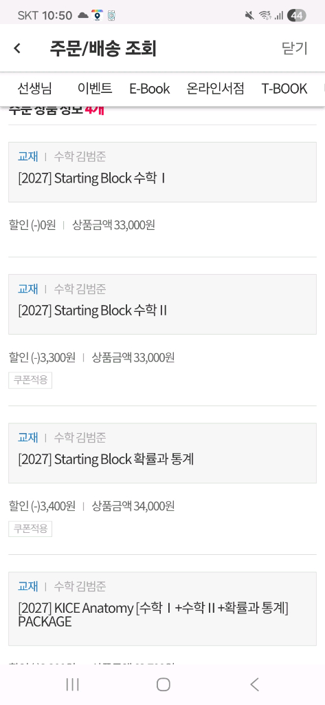 확통 스타팅 블록이랑 수1수2확통 카이스아나토미는 전부 다 새책입니다 수1수2 스타팅 블록은 조금 사용했습니다 수1은 렉쳐5, 수2는 렉쳐7까지 사용했으나 교재에 풀이나 강의 필기는 거의 없고 정답표시위주입니다 (수2는 렉쳐2까지 필기되어있습니다) 수1수2 스타팅블록은 각각 2만원, 확통은 2만8천원 카이스아나토미는 각각 1만8천원이고 6권 다 구매하시면 반택포포함 9만8천원입니다 ★많이 싸게 내놨다 생각해서 네고 절대 안 받습니다★
