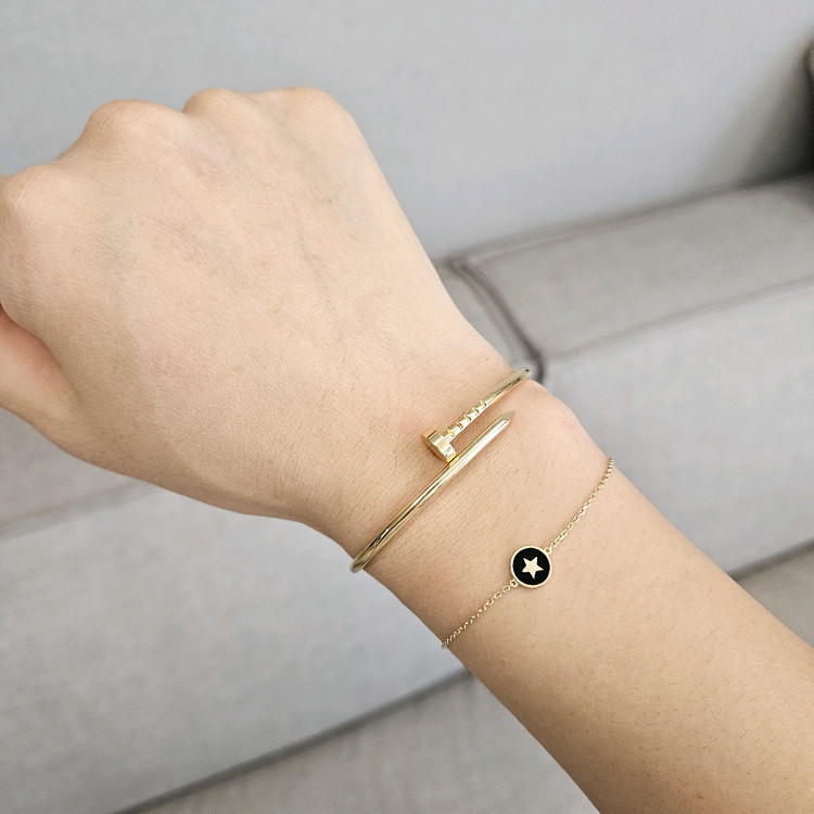 도나앤디 14k 팔찌입니다 한쪽은 블랙 별 / 한쪽은 화이트 K 양면이에요 일반장식에서 >>> 붕어장식으로 변경해 추가금까지 20얼마에 구매했어요 비슷한 다른곳 제품 245000원 0.7g 이네요 총길이 15.5cm 중량 1.0g 미세오차허용/가정용저울