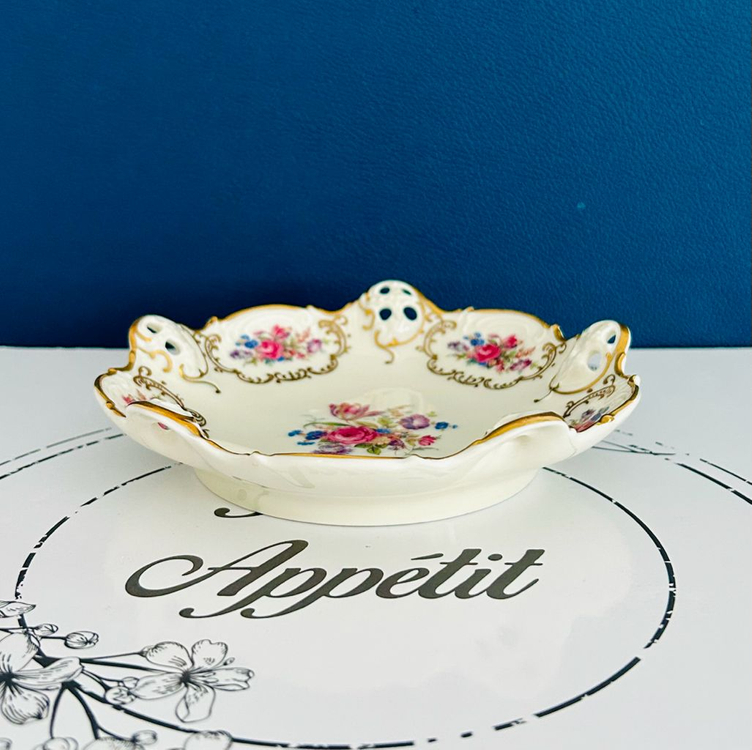 1940년대 전후 독일 로젠탈 크로나흐 공장에서 생산된 '몰리에르' 라인 빈티지 플레이트입니다. 부드러운 아이보리색 바탕에 화사한 플라워 패턴과 22K 금장이 어우러진 우아한 제품으로, 무엇보다 접시 테두리에 구멍을 뚫는 투각(Pierced/Openwork) 기법은 공정 중 파손율이 높아 일반 접시보다 생산량이 적고 단가가 높게 책정되었다고 하네요!^^ 일반 접시보다 깊이감이 있는(3.5cm) 오목한 형태라 쓰임새가 좋으며, 포푸리 볼이나 인테리어 소품으로도 아름답게 쓰일 수 있답니다~💕 컨디션 양호하고 좋습니다. 마지막 사진은 AI를 활용한 이미지 컷입니다. <사이즈> 접시 지름: 15.5cm 깊이: 3.5cm made in West Germany ➡️ 칩이나 크랙, 크레이징 없이 상태는 매우 좋습니다만, 그 당시 도자기 생산 공정시에 생긴 흔적들(깨점, 핀홀, 색묻음, 금장스침 등)이 보일 수 있습니다. ➡️ 다른 물건도 함께 올려놓았으니 둘러보세요^^