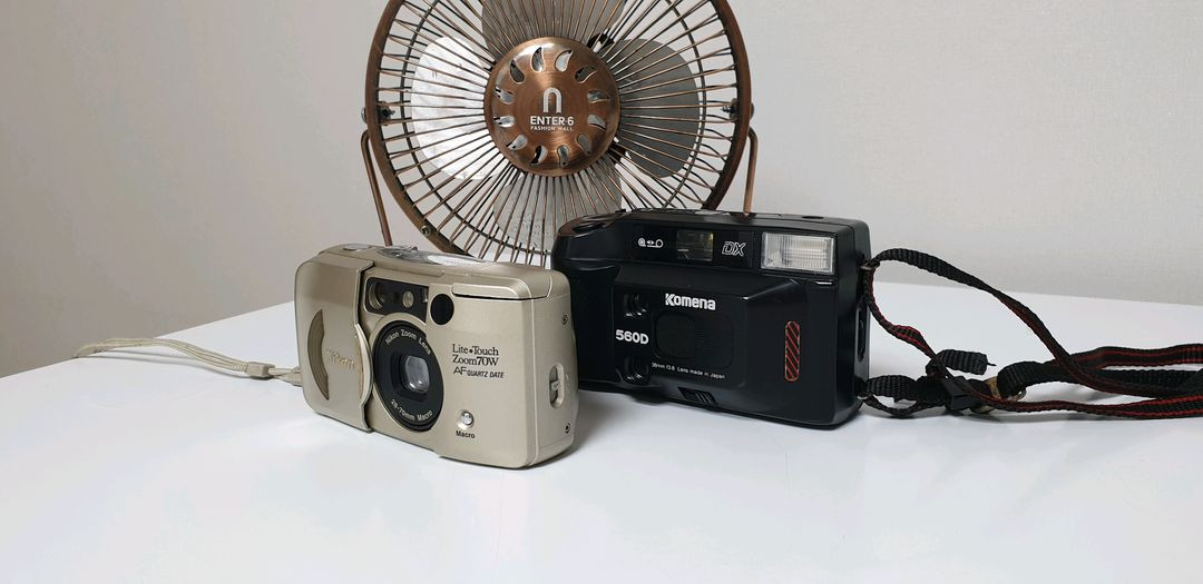 니콘 Lite Touch Zoom 70W와 Komena 560D 필름 카메라 2종 세트입니다 - 니콘 Lite Touch Zoom 70W: 금색, 28-70mm 줌 렌즈 - Komena 560D: 검정색, 38mm F28 렌즈 작동여부는 알 수 없습니다 부품용이나 빈티지 소품으로 활용하실 분 ~