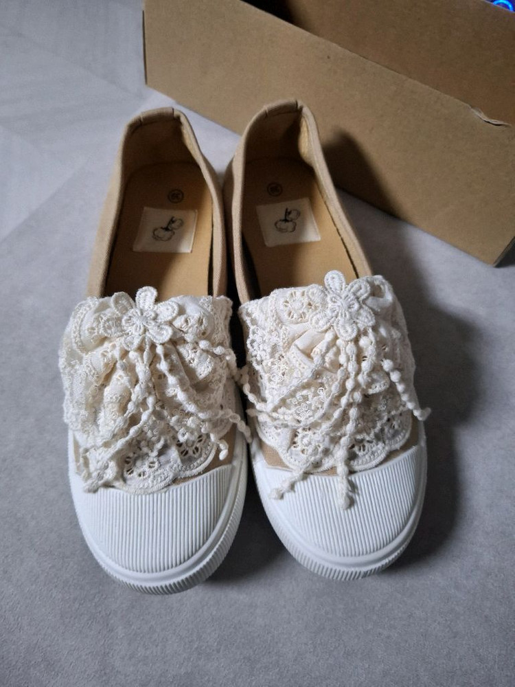 레이스 장식이 예쁜 베이지 컬러 슬립온 스니커즈예요. 박스 포함 새 상품입니다. 편하게 신기 좋은 깔끔한 디자인이에요. 봄에 롱스커트에 원피스에 신으려고 구매했는데 개인사정으로 판매합니다. 베이지색상 245ml 레이스 덧신도 같이 판매해요. 색상은 3가지 (블랙/코코브라운/그레이) 1켤레 2500원 입니다.