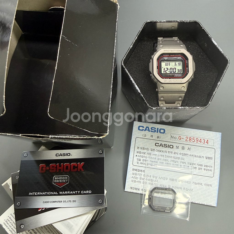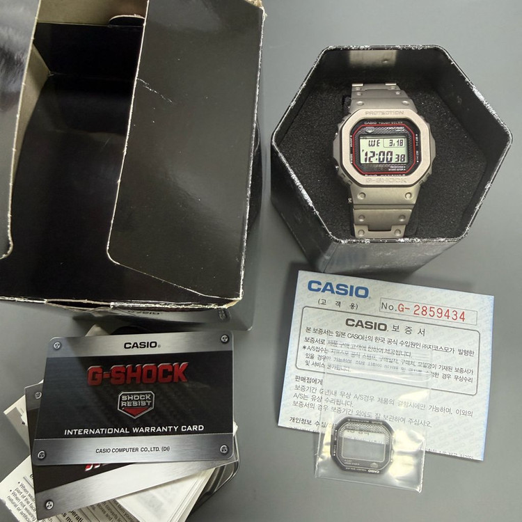카시오 지샥 GMW-B5000 풀 메탈 시계입니다 보증서 및 풀박스 풀구성이구요. 기존 글라스 챙겨드립니다. 새상품 mrg 커스텀 글라스 및 새상품 티타늄 벨베젤 이렇게 커스텀 되어잇습니다. 미사용 새상품입니다. 터프 솔라 기능으로 태양광으로 충전이 가능하고, 블루투스 기능으로 스마트폰과 연동할 수 있습니다 멀티 밴드 6 기능으로 세계 6개 지역의 표준 전파를 수신하여 정확한 시간 유지가 가능합니다