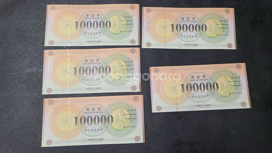 해피랜드 10만원 상품권 5장입니다. 압소바, 해피랜드 ,치엘로, 엠유스포츠 ,파코라벤베이비 가능합니다 2026 년3월17일부터5년이내 사용가능 직거래 ㅡ 제가 차가 없어서 장안면으로 오셔야합니다 - 450,000 등기시 - 460,000 (등기비포함)