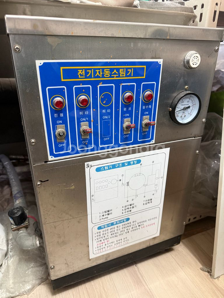 개인정보(거래정보)를 주고받는 행위는 사기에 노출될 수 있으므로 즉시 중고나라로 신고해 주세요 전기자동 5키로 스팀보일러_(스팀다리미 & 스팀기동) 스팀 온도 조절 다이얼과 압력 게이지가 있어 사용하기 편리해요. 세탁소 또는 아이롱 스팀다리미등 업소나 식당 운영하시는 분께 추천드립니다. 전기 3상 전기 연결해서 사용하니 참고하시기 바랍니다