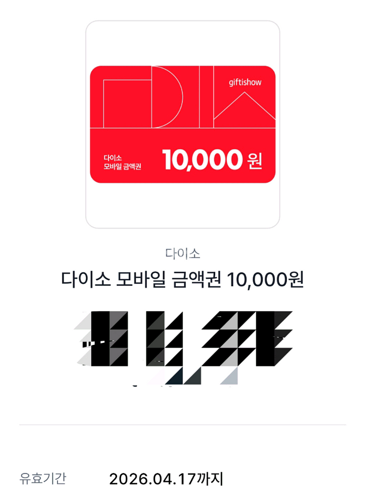 다이소 1만원 모바일 상품권(금액권) 판매해요 기한은 26.4.17까지 입니다 계좌입금확인 후 바코드보내드려요
