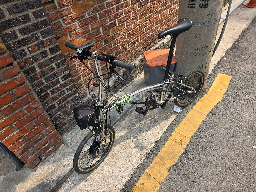 유사브롬톤 크롬도금 트라이폴드 전기자전거 입니다. 350W 전륜구동 모터 장착으로 70키로 주행 가능합니다. 16인치 폴딩 프레임으로 상태 양호합니다. 주행거리 1000km 트라이폴드 접이식이라 경차트렁크에도 들어갑니다. PAS 방식이라 사고시 배상책임보험 가능 일반 자전거 취급입니다. (면허 없어도 됩니다) 날씨도 좋은데 이쁜 자전거 타시면서 봄바람 즐기세요 ~~~ 😊👍🏻