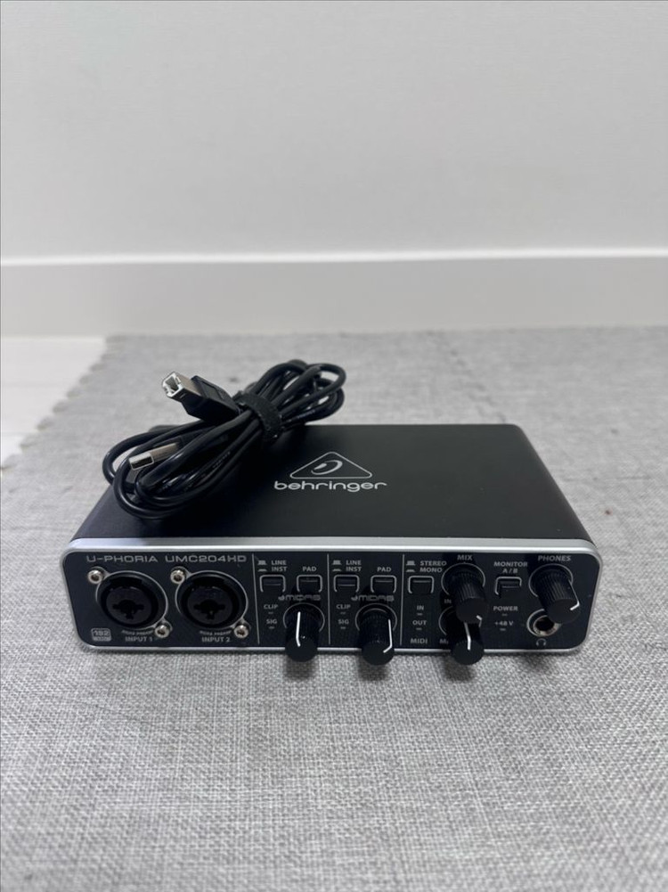 베링거 U-PHORIA UMC204HD 오디오 인터페이스입니다 - 24비트/192kHz 해상도로 뛰어난 음질을 제공합니다 - MIDAS 설계 프리앰프가 장착되어 있습니다 - 제로 레이턴시 모니터링이 가능합니다 - USB 케이블 포함